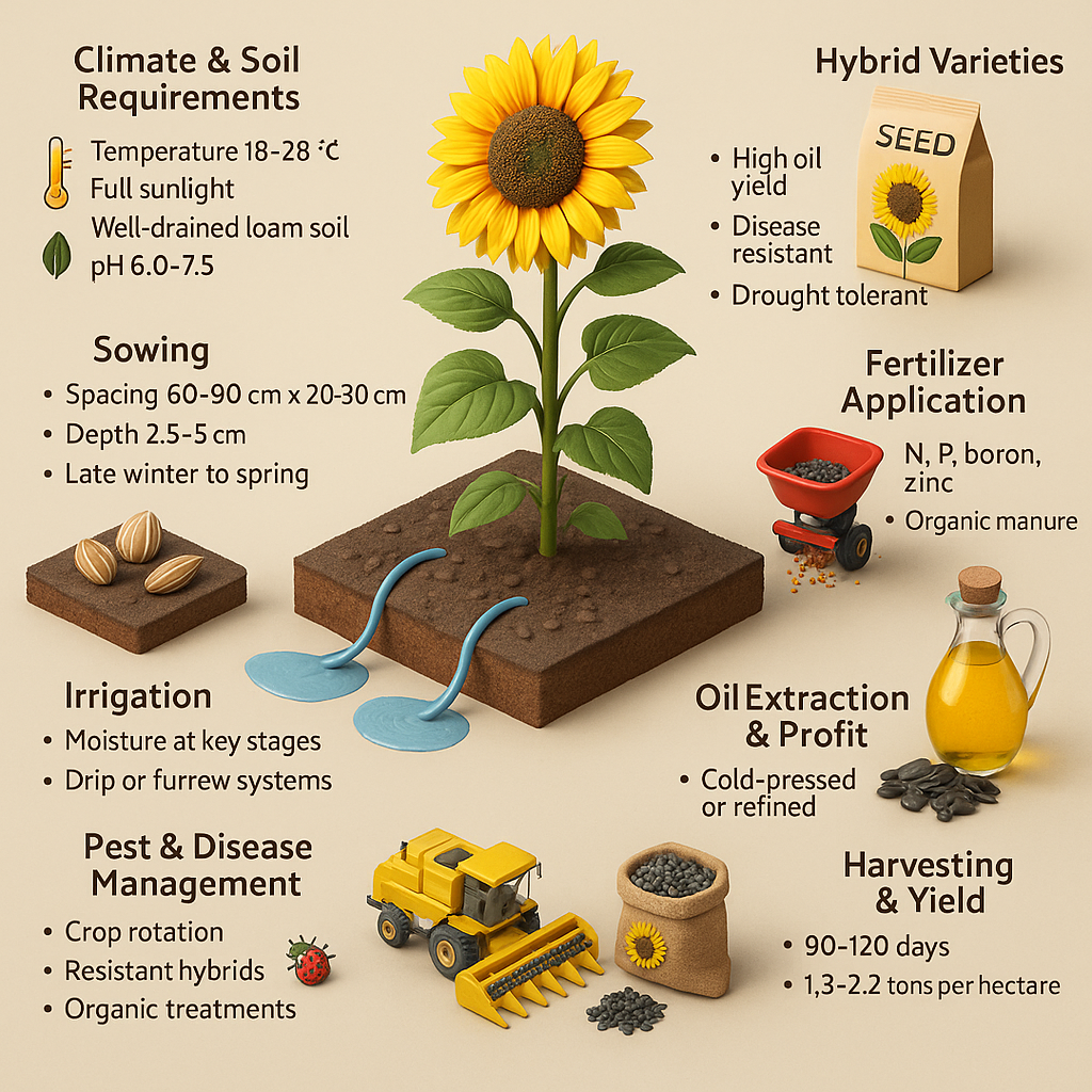In conclusion, sunflower farming stands as a profitable and flexible agricultural venture suitable for diverse landscapes across the world. Its role in edible oil supply, livestock feed and industrial uses ensures consistently strong markets. Farmers who adopt scientific practices—correct sowing time, balanced nutrition, water management and clean harvesting—produce high-quality seeds with excellent oil content and dependable income.