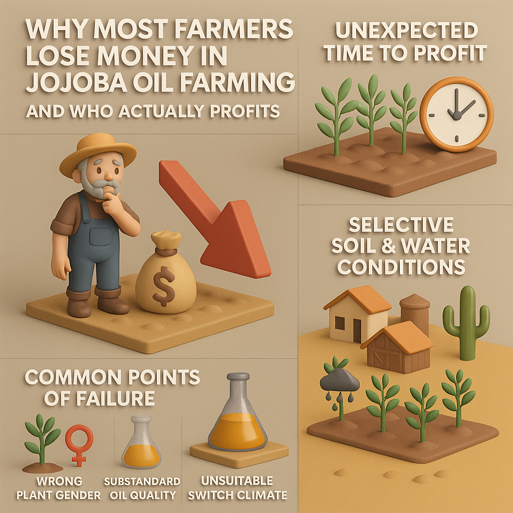 The biggest mistake people make with jojoba oil farming is believing that demand alone guarantees profit. On paper, jojoba looks like the perfect crop. It grows in dry areas, needs little water, survives heat, and sells into cosmetic and pharmaceutical markets that talk in dollars, not kilograms. Because of this, thousands of farmers enter jojoba farming with the assumption that low input plus high price equals easy income. That assumption is exactly where losses begin.
