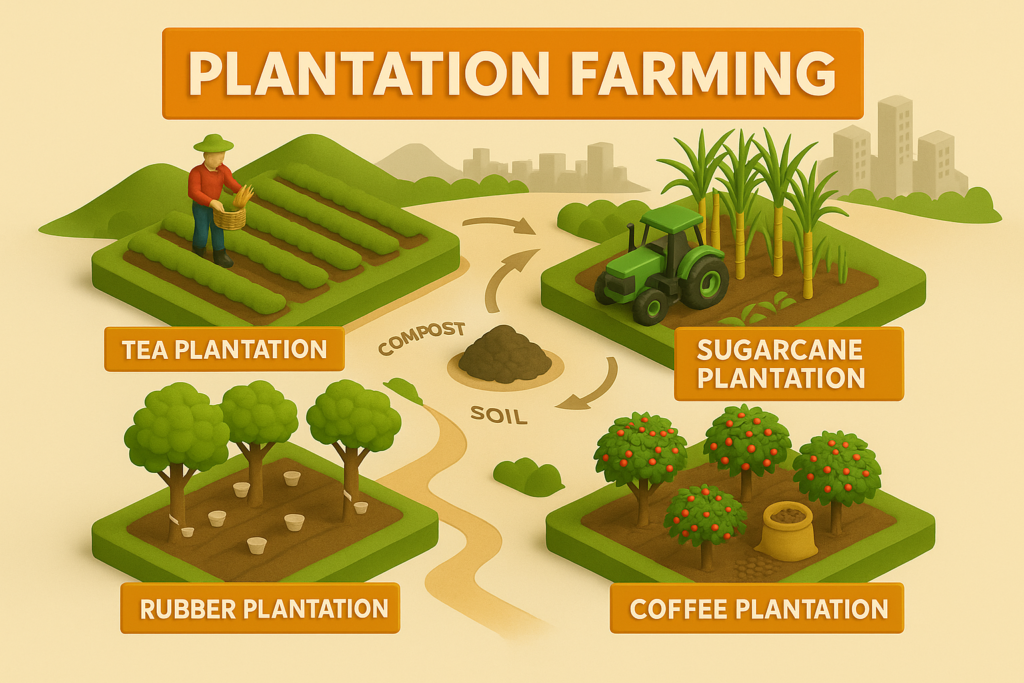 Plantation farming represents one of the most influential agricultural systems in the world. It is a large-scale, commercialized farming method built around a single major cropknown as a monoculture crop cultivated primarily for export and industrial use. Unlike subsistence agriculture, which focuses on feeding the farmer’s family, plantation farming is designed to produce huge volumes of high-value crops for global markets, often operated with advanced management systems, hired labor, and significant capital investment.