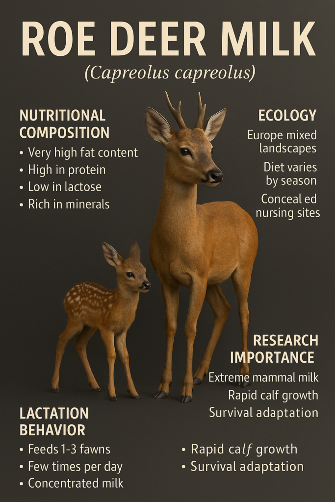 This chapter exists because roe deer milk represents an evolutionary extreme — a milk architecture built not for volume, comfort or prolonged feeding, but for explosive early development. Understanding it expands global dairy science beyond industrial breeds and places your encyclopedia at the frontier of wildlife nutrition knowledge.