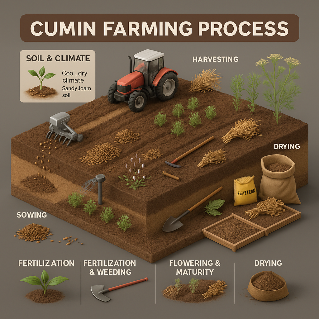 Cumin is a unique spice crop because it performs best where many other crops fail. Dry climates, sandy soils, low humidity and cold winters suit its physiology. The plant’s lifecycle, delicate flowering structure and sensitivity to moisture make it challenging but highly rewarding when managed correctly. Farmers across continents approach cumin farming as a precision-timed crop — sown under cool conditions, grown under dry air and harvested under clear skies.