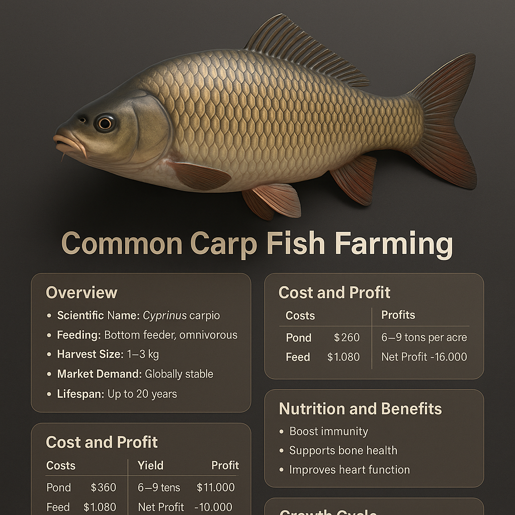 Common Carp is one of the most reliable, profitable, and sustainable fish species in global aquaculture. It provides strong yields, stable markets, easy farming management, and long-term income. Its adaptability makes it ideal for both small farmers and commercial enterprises. With proper water quality, feeding, and disease management, Common Carp delivers consistent production and strong profitability.