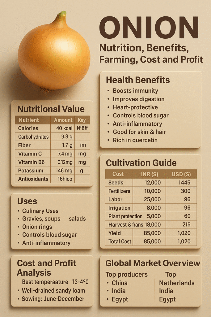Onion farming success depends on even moisture, thrips control, balanced nutrition, airflow, and proper curing. Preventive field management and careful post-harvest handling decide both yield and market value. This guide gives farmers a complete, practical system used across major onion-growing regions worldwide.