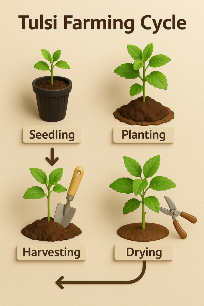 Tulsi farming is profitable only when linked with buyers. Growing Tulsi without a market plan leads to losses.
